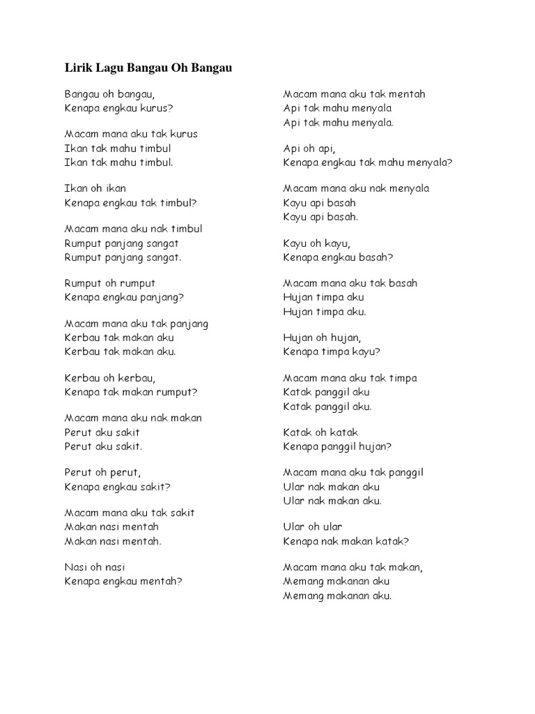 Bangau oh bangau kenape engkau kurus. Macam mane aku tak kurus ikan tak nak timbul. Lirik Lagu Bangau Oh Bangau.